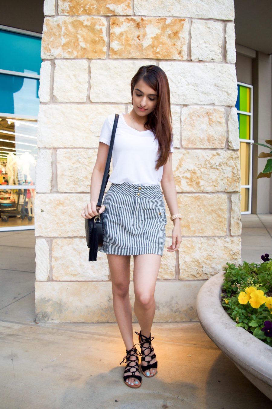 Anyway, I’m currently sipping on some green tea and in total casual spring style mode today (as you can tell). This white tee from Nordstrom is my absolute fav! It’s so incredibly soft and goes with practically anything. And hey, it’s on the cheaper end so why not?! It must be said though, it is a tad bit see-through so I’m wearing a white tank underneath… ya know, to keep things PG. I threw this tee on a stripe skirt from Urban Outfitters which made my outfit super casual with a vintage touch! I don’t know about you gals but I love anything and everything with pockets (I’m such a compartment nerd) and this skirt has oversized pouch pockets which are adorable and practical. Everything down to the buttons on this skirt is fabulous. You can totally dress this up too so with a cute off the shoulder top! Also, can we talk about these sandals for a hot minute?! These Dolce Vita gladiator sandals ARE THE BEST. I walked a lot in these sandals and it felt like I was walking in comfy sneakers the whole time. I didn’t have any weird sores, pains or blisters. They are seriously perfect and under $100!! I needed some black gladiators so this were a perfect match for me but these do come in other colors too, so check it out! 🙂